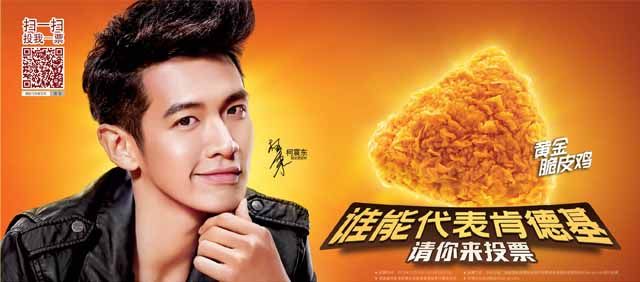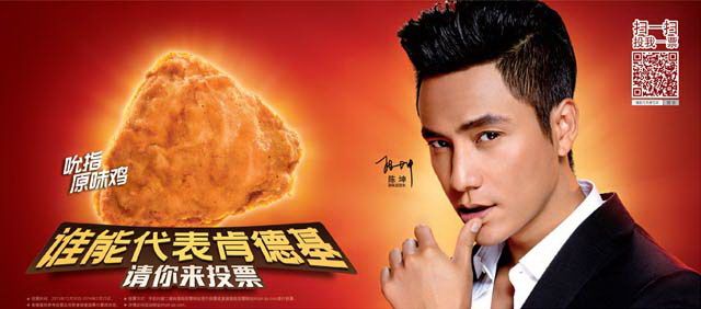 一个有代表性的案例是肯德基在2014年新年档发起的”谁能代表肯德基“的投票。品牌把有一票忠实消费者的菜单老牌吮指原味鸡、与新品黄金脆皮鸡放在一起比较,还请来陈坤与柯震东代言二者。