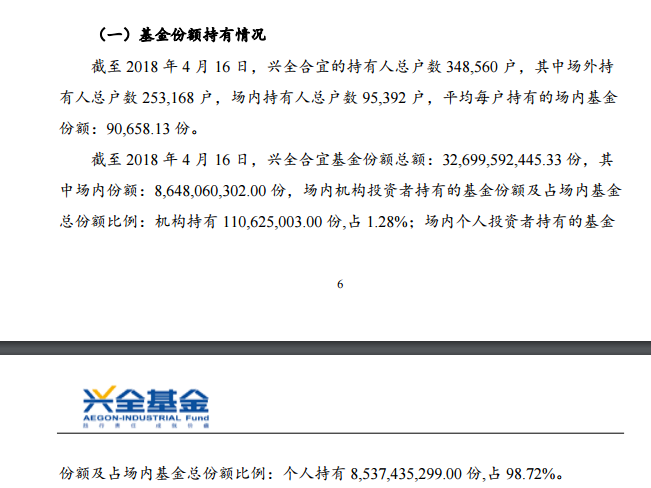 兴全合宜的此前的公告显示,至2018年4月16日,兴全合宜基金份额总额约327亿份,其中场内份额约86亿份,9.5万户。场内机构投资者持有的基金份额及占场内基金总份额比例为:机构持有1.1亿份,占1.28%;场内个人投资者持有的基金份额及占场内基金总份额比例为:个人持有85.4亿份,占98.72%。以兴全合宜的场内86亿份计算,这9.5万名场内投资者上市当日共浮亏6.22亿元。