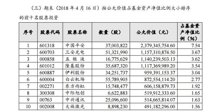 今天,兴全合宜上市的当日,该基金也公布了基金一季报。一季报显示,兴全合宜前十大重仓股为中国平安、三安光电、五粮液、隆基股份、伊利股份、白云机场、东方雨虹、中际旭创、中兴通讯、大族激光。投资风格是基金经理谢治宇比较擅长的价值投资,重点布局了价值股龙头、成长股龙头等股票。而近期灾祸连连的中兴通讯正是该基金的第9大重仓股。