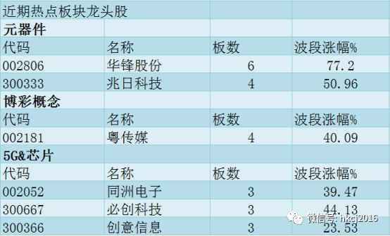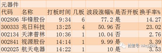 上涨情况:近期元器件板块持续上涨,今日有5只个股涨停,其中华锋股份和兆日科技分别以6个和4个涨停板位居龙一和龙二的地位。