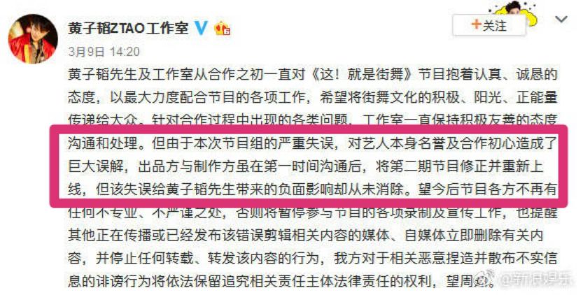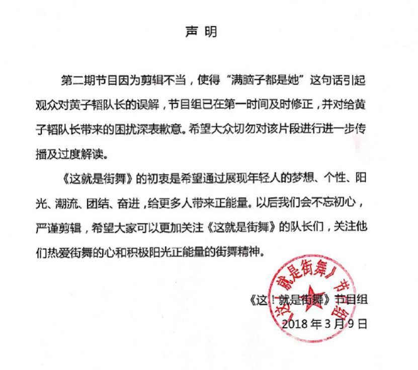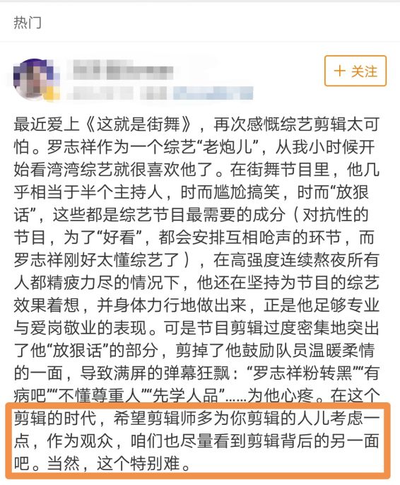 目前看来,这仍然是一个有待研究的课题,只是在这之前,出事儿了剪辑来扛却正在成为一种“新常态”。3月9日,黄子韬手撕《这!就是街舞》之后,灿星发表声明表示“剪辑不当引起误解,以后会不忘初心,严谨剪辑“。诸如此类,屡见不鲜,只是剪辑师真的背得了锅吗?