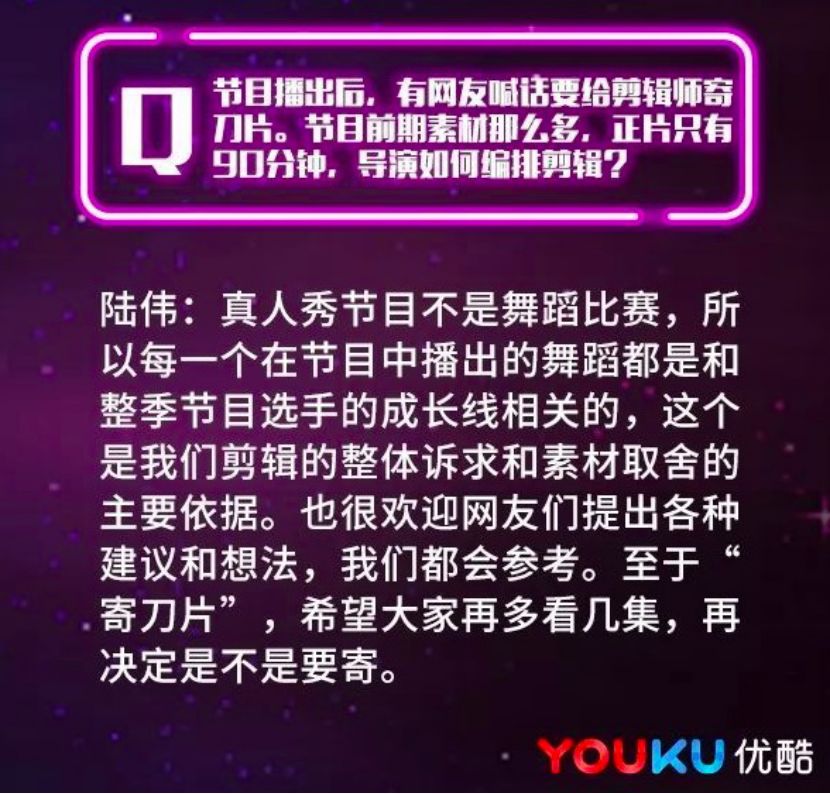 问题频出,不论是出于哪个原因,剪辑总是“首当其冲”被群起攻之。谈及有些节目的后期剪辑会被粉丝疯狂diss怎么办,赵林林解释,“大多数粉丝们并不会像行内人一样注重节目整体的精彩程度,乃至整季节目的故事主线和成长脉络,更多在意的是自己爱豆的镜头时长和当期节目呈现。我们能够理解粉丝们的心情。”