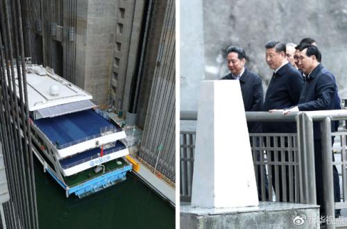 离开许家冲村,习近平来到三峡大坝,登上坝顶,极目远眺长江上下游,详细了解三峡工程建设、发电、水利、通航、生态保护等方面的情况。随后,前往通航船闸、升船机和左岸发电厂实地调研。