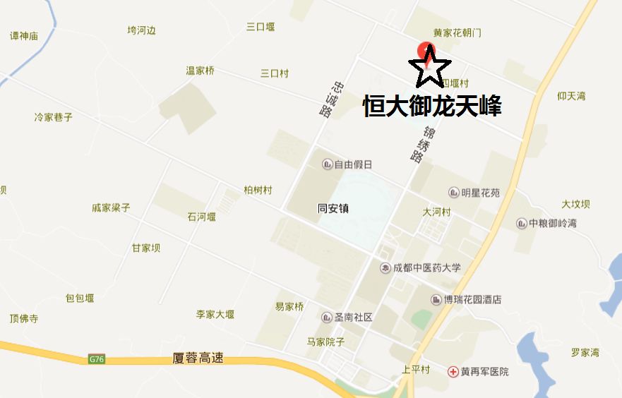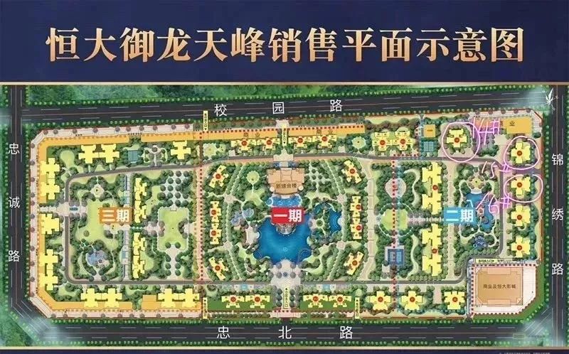 恒大御龙天峰项目位于锦绣路和忠北路交汇处,四面临路,东北侧为校园路、西北侧为忠诚路、西南侧为忠北路、东南侧为锦绣路。