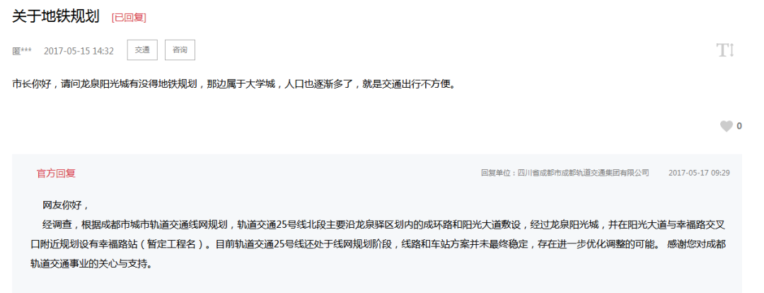 网传,阳光城有地铁25号线的规划,我在地方政府留言板上也找到了官方的相关回复。但根据相关信息显示,该条线路还处在线网规划阶段,因此未来是否能为阳光城板块的公共出行带来改善,还是个问题。