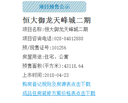 4月23日,位于龙泉驿区的恒大御龙天峰项目取得了新的预售证,这是该项目今年以来第三次拿预售证。