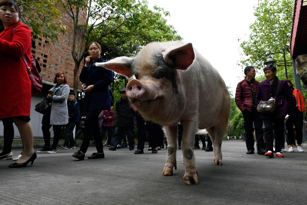 2018年4月15日,成都街头,“猪坚强”外出遛弯,成了游客追逐的对象。
