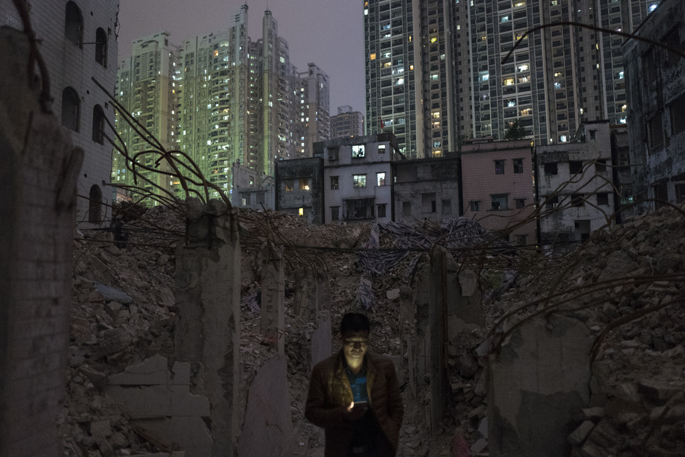 2017年12月13日,广州,入夜后,广州冼村范阳大街两旁的每块空地上都有人在用手机看视频、玩游戏、打电话。由于村里信号不好,主干道上开阔的空地便成了大家获取手机信号的最佳场所。