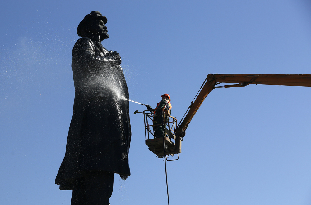 当地时间2018年4月20日,西伯利亚克拉斯诺亚尔斯克市,为庆祝列宁诞辰148周年,工人们正在清洗他的雕像。