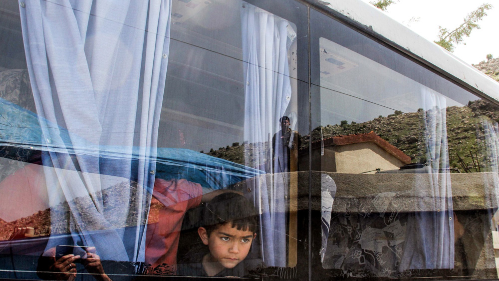 当地时间2018年4月18日,黎巴嫩南部Shebaa村,逃至当地的叙利亚难民搭乘大巴启程返回大马士革郊区。
