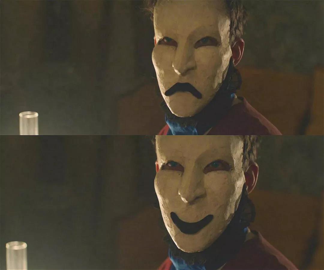 喉咙发出混沌的声调,夸张的肢体动作,怪异的面具,还有那些极为抽象的画作。它们建构出爱德华,忧郁又癫狂,敏感又多情,在“大眼萌”纳威尔极其卖力的演绎下,显得更为立体传神。一个好的演员在于让观众能够全身心的感受到他的炙热情感,更何况纳威尔全程几乎都只带着面具。