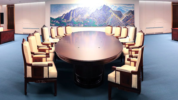 报道说,出于对缩短双方心理距离的考量,会场用椭圆桌代替了普通的方桌。其最宽处为2018毫米,象征着朝鲜半岛在2018年迎来和平。