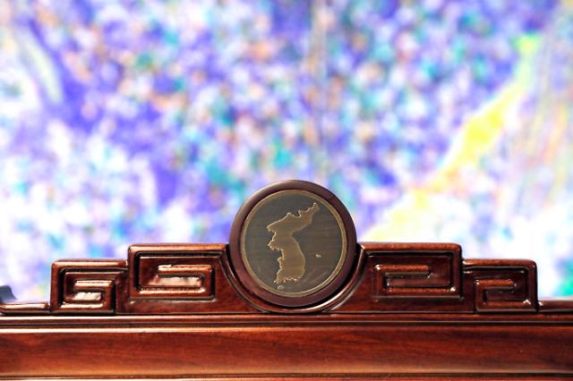 椭圆会议桌两侧分别摆放7把椅子,朝韩首脑将在中间就坐,他们的一号座椅最上方刻有朝鲜半岛地图,独岛也包含在内。