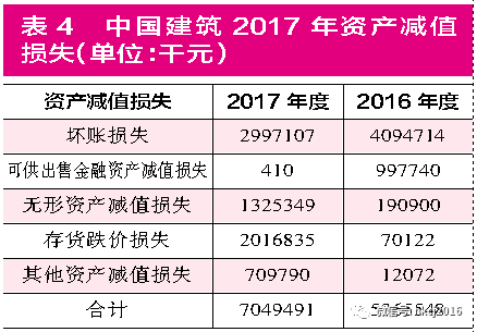 数据显示,中国建筑2017年的资产减值准备达到了185.35亿元,占净资产的比重达到9.27%,创下历史新高。同时,中国建筑2017年计提的资产减值损失达到了70.49亿元,占净资产的比重达到了3.5%。但笔者在仔细查阅财报附注的数据后发现,中国建筑的坏账损失在2017年是在减少的。(见表3、表4)