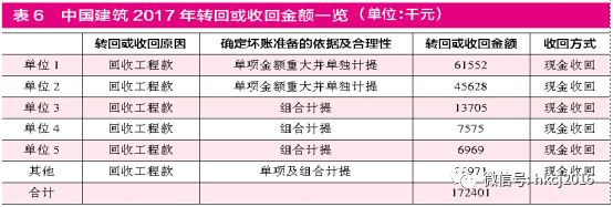 笔者认为,坏账损失减少的原因在于中国建筑每年都会针对应收账款计提,一年以内计提5%的比例可以算作一个很保守的会计处理方式,而且每年坏账的计提都会转回一部分,真实发生的坏账比例很低。中国建筑2017年年报显示,2017年度计提的坏账准备金额为5.57亿元,收回或转回的坏账准备金额为1.72亿元。其中重要的收回或转回金额如下。(见表5、表6)