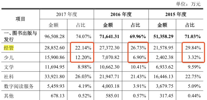 其招股说明书也印证了这一猜测,2015年-2017年,其经管类图书占主营收入构成比例分别为29.84%、26.73%和22.14%,呈下降趋势;而少儿类图书占比分别为3.32%、6.9%和12.2%,上升趋势明显。并且,从下图可以看出,到2017年,中信出版的经管类图书营收占比尚不如社科类图书,主导地位不再。