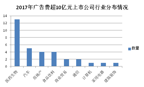 1837家上市公司中共计33家广告费超过10亿元,医药生物行业的上市公司数量最多,达到13家,汽车行业紧随其后,达到5家,而房地产以及食品饮料两个行业并列第三,均有4家公司。