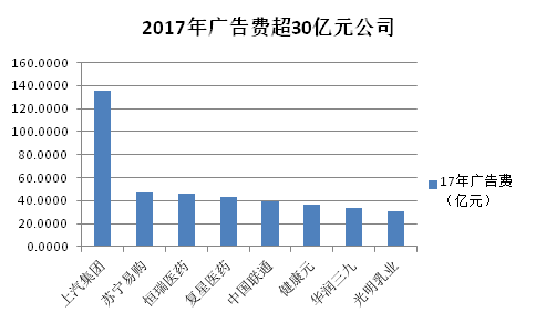 更有8家上市公司广告宣传费用超过了30亿元,分别来自医药生物、食品饮料、汽车、商业贸易以及通信行业。其中,上汽集团(600104.SH)以136亿元位居榜首,苏宁易购(002024.SZ)以及恒瑞医药(600276.SH)分别以47亿元和46亿元分居第二、第三位。