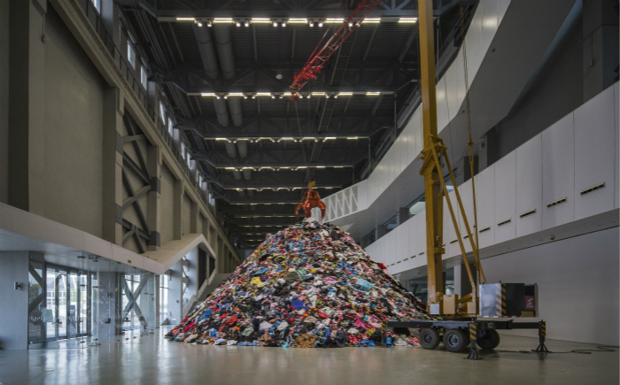 《无人》(Personnes)最早在2010年巴黎大皇宫Monumenta展览上亮相,之后在纽约、米兰和日本“重演”。此次在PSA一楼1200平方米的空间内,将近10吨全部收集自中国的衣服堆砌成一座山,高达15米的起重机钩爪悬于其上,重复抓起、抛下衣服的动作。“Personnes”在法语中是个双关词,有着“人们”和“无人”双重含义。艺术家运用这个双关词强调了衣物所指代的“人们”最终幻化为“无人”的境况,命运的遴选机凌驾于每一个个体之上。散落在一楼侧厅的衣物遮蔽整个地面,特别设置的人形通道邀请观众穿梭其间,在无人之境想象衣物所有者的样貌。