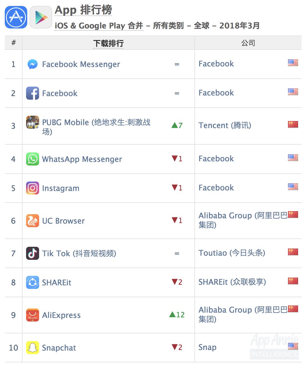 而在App Annie的监测报告中,《PUBG Mobile》这款腾讯推出不足三个月的手游,甚至撼动了Facebook旗下四款社交应用长期霸榜的格局,闯入全球下载榜单(iOS和Google Play合并)的前三名。
