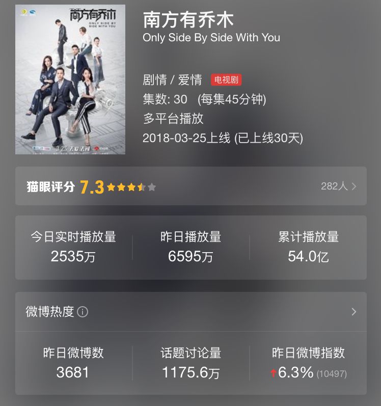 《南方有乔木》由陈伟霆和白百何主演,根据猫眼提供的数据,该剧累计播放量目前已超过54亿。