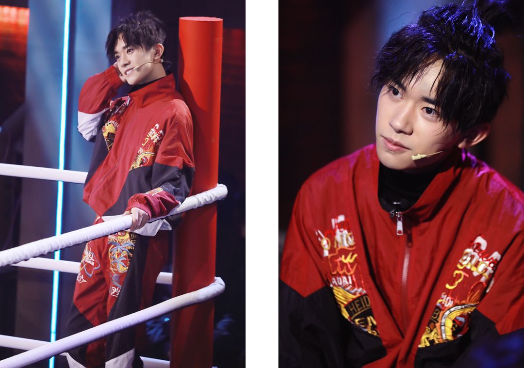 像易烊千玺的这套就很厉害,红色机能风外套搭配运动裤,上面印着龙的图案(他自己就是龙年出生的),