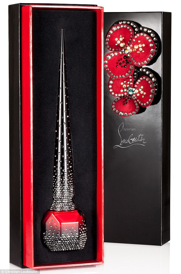 此名为Starlight(星光)的节日限量版不同于店内其他系列甲油,独特的指甲油瓶身手工镶嵌了1500颗水晶。黑色漆面包装盒由两朵水晶镶嵌的皮革花瓣装点,灵感源自价值1395美元的2014秋冬新款红底鞋Pensamoi。