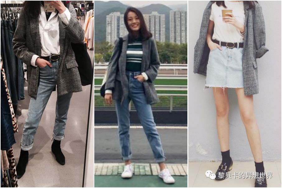 搭配灵感:这件小西装购于伦敦,sale价30镑。我用这件外套搭配了冬、春、夏三个季节。冬季内搭黑色高领衫白色衬衫,配牛仔裤和黑色尖头靴。春季配条纹针织衫、牛仔裤和小白鞋。夏季搭配白T牛仔裙和黑色鞋子。