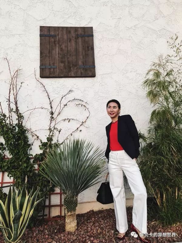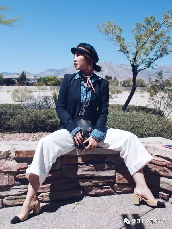 搭配灵感:第一种是非重要工作日的日常通勤,简单的白色阔腿裤搭配藏蓝色西装反差较大,海军帽真的是帅气到爆炸。第一就是上班套装搭配亮色高跟鞋。