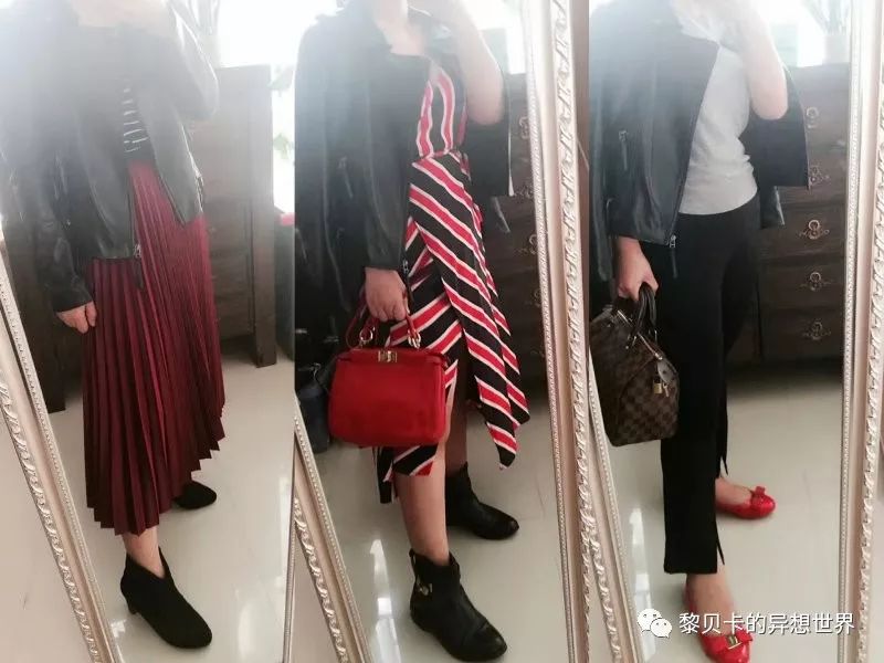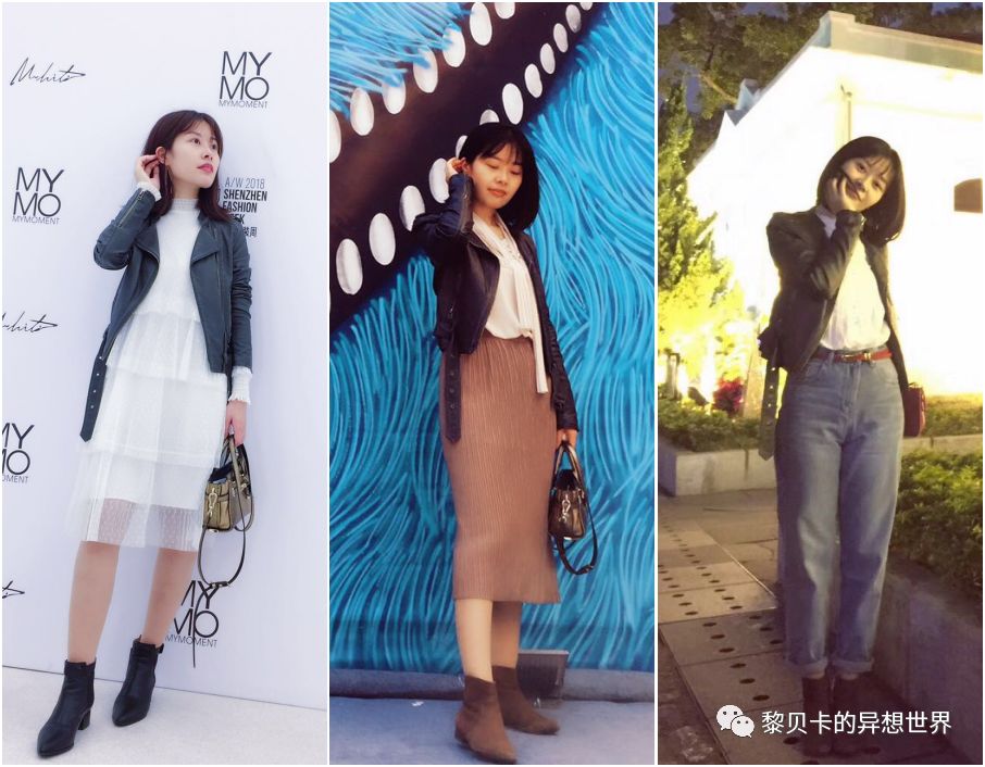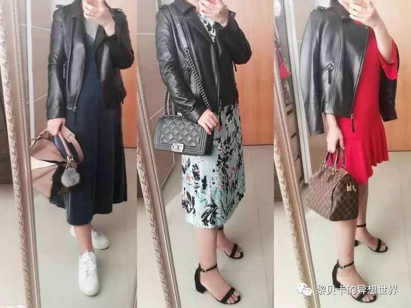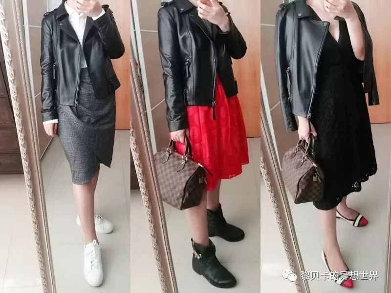 搭配灵感:超喜欢这件小皮衣,黑灰色很特别,低调有内涵。分别搭了裤装、连衣裙和半身裙,都是卡卡娘man平衡的招儿。