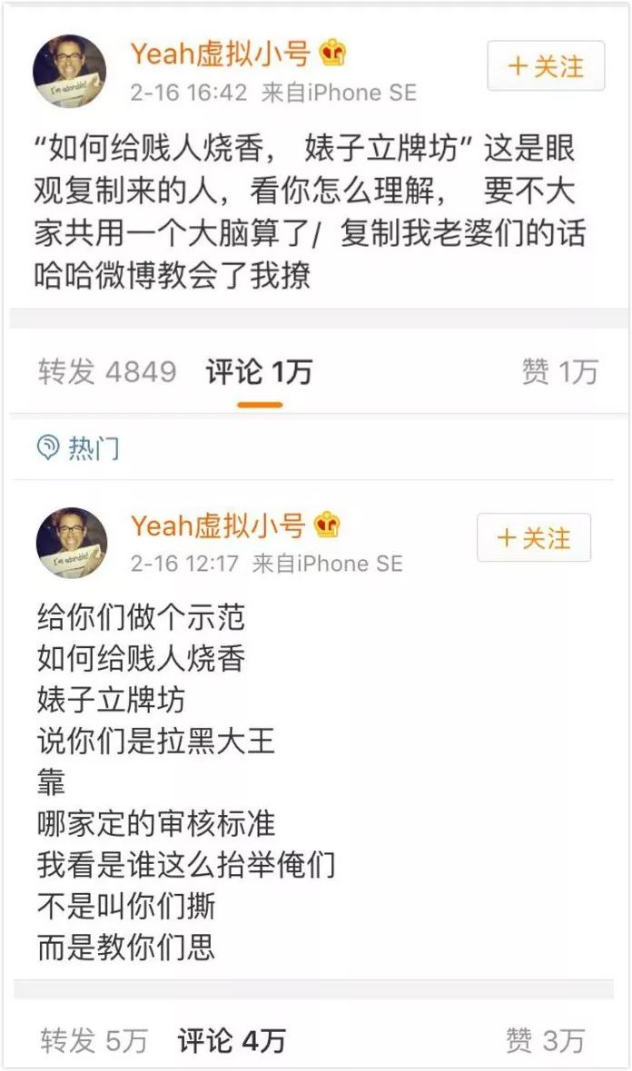 在微博上开了个小号名叫“Yeah虚拟小号”,发的内容充满各种奇怪粗俗的字眼,不是教粉丝撕逼就是开撕粉丝。