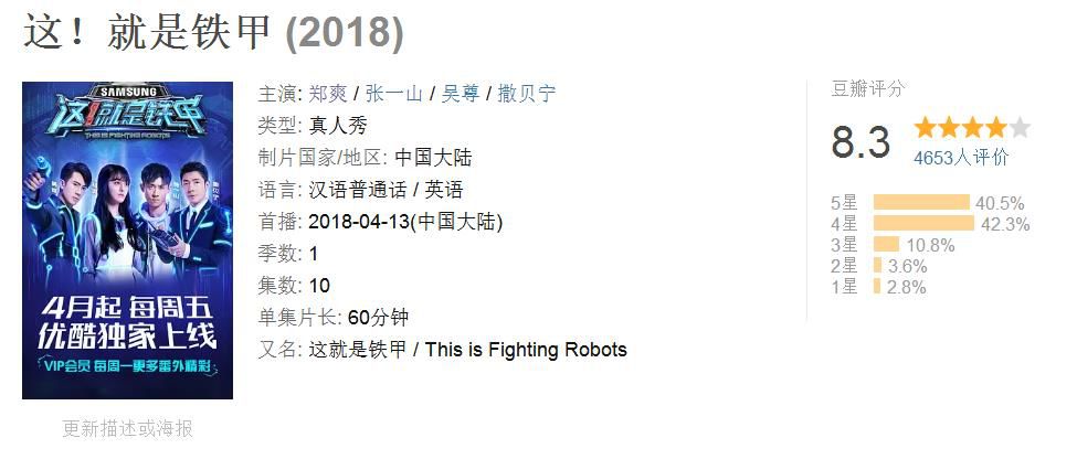 虽然铁甲节目在国内综艺市场里还处于默默无闻的状态,但是一档《这就是铁甲》能做到8.3分的高分,确实有它值得存在的理由。