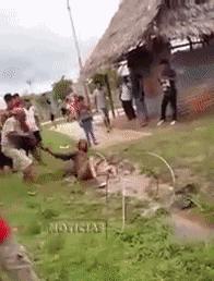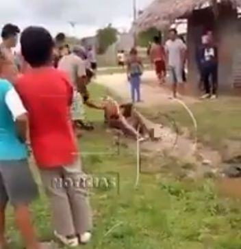 从该视频可以看到,受害人浑身是血,被殴打后躺在泥地中哀嚎,随后,被暴徒在脖子上系上麻绳,在泥地里被拖行后吊死。