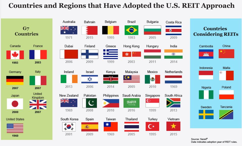 REITs遍布全球,截止目前已有37个国家推出REITs