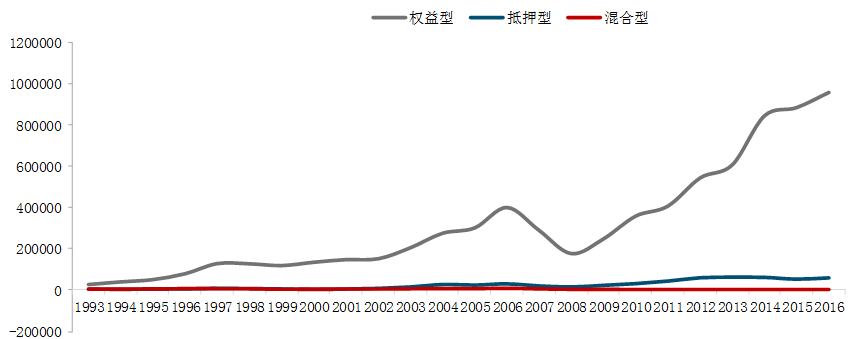根据投资标的,美国REITs可划分为权益型、抵押型和混合型三种。目前美国市场上最主要的是权益型REITs,占比90%左右,也是最能体现房地产特性的REITs产品,其投资并拥有房地产项目,同时通过运营实现增值。投资覆盖范围有公寓、办公楼、商业、养老、医院、零售等项目,主要收入来源于项目的租金收益或资产未来增值收益。抵押型REITs通过抵押贷款的形式借钱给开发商,或者自己直接购买住房抵押贷款证券(MBS),收入主要来源于利息收入,通常这类REITs股息收益率比权益型REITs高,风险也大。混合型REITs结合了权益型REITs和抵押型REITs,同时拥有房地产项目和抵押贷款,但在一定程度上会受到利率变动的影响。截止到2016年末,美国市场共发行REITs产品200多只,市场价值达到1.01万亿美元,其中权益型REITs产品占比达到94.3%。庞大的市场规模无疑奠定了美国REITs世界领先的地位,也验证了REITs的巨大成功。