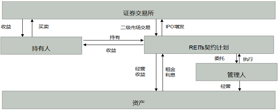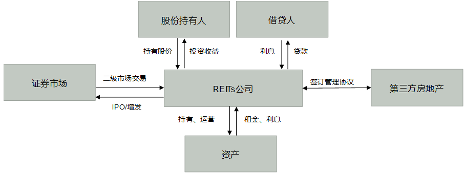 美国REITs的运作模式依据组织结构不同,可分为契约型和公司型两种。公司型REITs是指设立以房地产投资为目的的股份有限公司,投资人购买公司股份,公司将收益以股利形式分配给投资人,公司型REITs在美国占据绝大多数的市场份额。契约型REITs是指信托人和受托人在以房地产为投资标的信托契约的基础上,将该契约的收益加以分割,使投资人取得可以代表这种权利的收益凭证,以新加坡和香港为代表的亚洲国家以契约型REITs为主。
