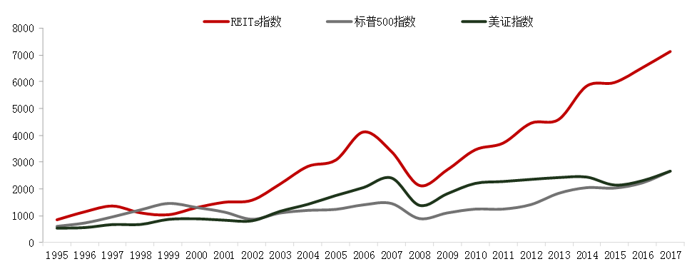 美国的REITs领先于世界水平,不仅仅表现在其规模上,在收益上的表现更胜一筹。根据同花顺公布的标普500指数、美证指数以及NAREIT网站公布的REITs指数的相关数据可知,1995年-2017年底,REITs累计上涨751.6%,平均年化收益达12.36%,远远高于同期的标普500指数,美证指数的累计上涨幅度。更吸引眼球的是REITs每年固定提供90%的可分配收益分红,为投资者保证一定的现金流,相应降低了风险。