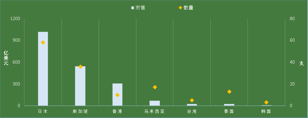 图:截止2017年6月亚洲各国REITs总市值及数量