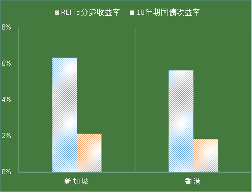 新加坡与香港为亚洲REITs发展较成熟地区,具备一定市场规模,收益率优势明显