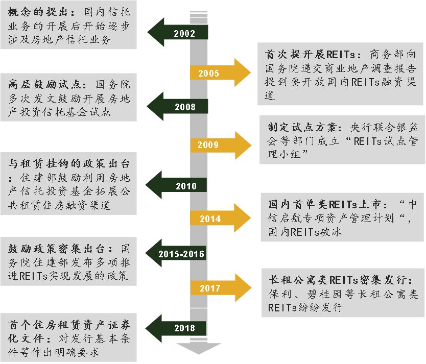与美国、新加坡、香港等已经成熟或处于基本成熟阶段的国家或地区相比,国内REITs还处于起步阶段。国内REITs的发展身影可以追溯到十几年前,2002年伴随国内信托业务的开展,也开始了对REITs的最初研究。随后从国家层面出台了很多鼓励性政策,但总体上其发展是缓慢的,相当长的一段时间里在REITs的推行落地上并未有实质性突破和进展。直到2014年,“中信启航专项资产管理计划”在深交所挂牌交易,首单类REITs产品在时隔十二年之久,终于在国内资本市场上登台亮相。