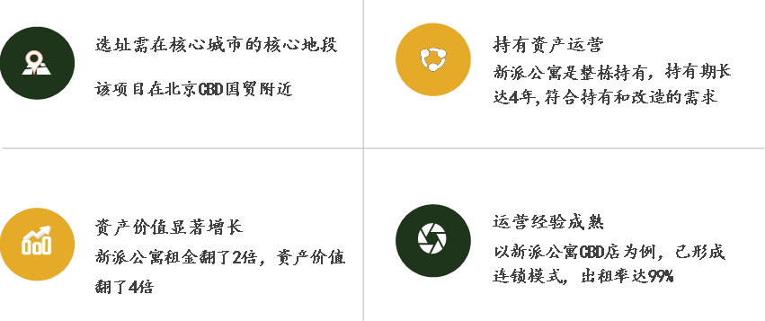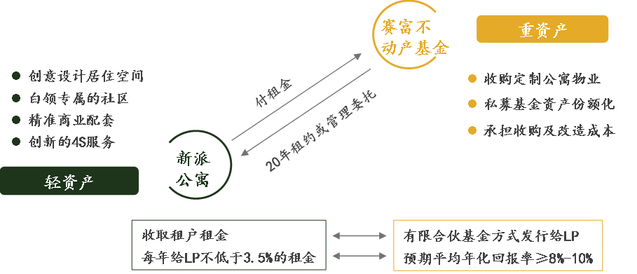 新派公寓是典型的交易所基金REITs模式,通过与赛富基金共同成立赛富不动产基金,收购了位于北京国贸核心区域的70年住宅产权物业,之后全面改造后成为白领长租社区。因其基础资产优质,即使在没有第三方信用支持的情况下,优先级依然获得3A评级。在整个资产运营的过程中新派公寓的投入是很少的,其精力主要在物业的出租经营与管理上,实现了真正的轻资产运营,而对于承担所有装修改造成本的基金来说,也通过新派公寓每年的租金分红以及资产预期增值获得了稳定的投资收益。