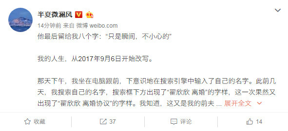 他在最后一条微博里,说我逼死了他,因此大家将矛头指向了我。如果真的是这样,我愿意承担所有的骂名。但如果真是我逼死的,他为什么不选择在离婚的时候,而是选择在离婚后四十多天?离婚那天他已经支付给我大部分离婚协议上约定的钱,离婚后第六天他主动约我去做离婚协议公证。随后这四十多天到底发生了什么事情,让他如此绝望?我不知道,也许永远都是一个谜。