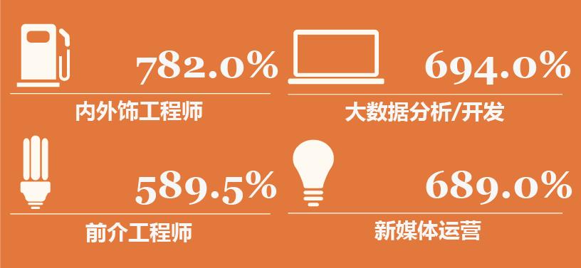 随着人工智能技术、电气自动化、物联网等在各行业的逐步渗入与被利用,以重复劳动为主体的岗位呈现较大的负增长。前程无忧一季度雇主新增岗位与求职者供给数据显示,以电话销售、餐饮服务员/店员、咨询热线/呼叫中心服务人员等为代表的基础重复类岗位数量比2017年同期明显下降。内外饰工程师、大数据开发/分析、新媒体运营与前介工程师分别以782%、694%、689%与589.5%的需求增量成为四大热门待招岗位,显示出高技能/高技术人才愈发受到市场的追捧。