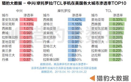 中国品牌在美国市场的主打产品依然属于中低端范畴。以美国市场占有率排名前三的中兴、摩托罗拉(联想)、TCL为例,从这些品牌在美国各个城市的渗透率来看,排名靠前的城市大多为非一线城市。