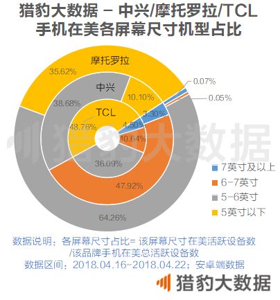 此外,由于小屏安卓手机多见于中低端机,因此屏幕尺寸也能在一定程度上反映出中国手机在美国的中低端路线。中兴在美国所有机型中,6-7英寸机型与6英寸以下机型各占一半;摩托罗拉以5-6英寸为主,占比64.26%;TCL则以5英寸以下小屏手机为主,占比48.76%。