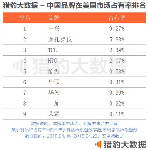 此外,美国市场上占有率前几位的品牌也与海外市场整体排名有出入。根据猎豹大数据,中兴为在美渗透最高的中国手机品牌,占有率9.27%,摩托罗拉(联想)排名第二,占有率5.83%。除以上两家外,中国手机品牌在美占有率普遍较低,华为与荣耀合并占有率仅0.41%,而小米尚未进入美国市场。