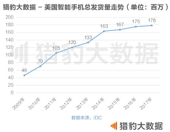 最后,美国市场近年来也出现了饱和的迹象。根据IDC发布的统计,去年美国智能手机销量同比增长1.6%,创下有史以来最低增速,总发货量则为1.78亿部。