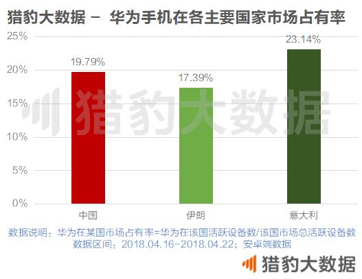 而就华为手机业务而言,退出美国带来的损失非常有限。猎豹大数据显示,华为、荣耀在美国市场份额占自身海外市场比重仅1.36%,且华为在中国的占有率比较稳固。在海外市场,华为、荣耀在伊朗和意大利也占有相当高的份额,合并占有率分别达到了17.39%和23.14%,均仅次于三星。