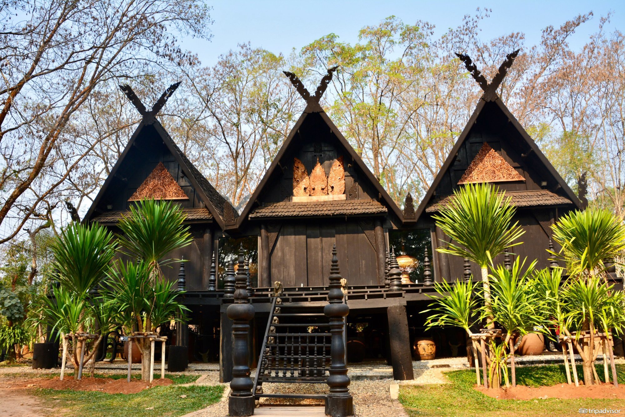 黑庙(Baan Dam Museum) 与白庙的辉煌闪耀不同,黑庙给人的感觉是黯淡。当然这个黯淡只是视觉上的,并不代表它的艺术造诣。虽然有着“庙”的名字,但黑庙其实是一个私藏的艺术博物馆,建筑是艺术家设计建造的,陈列品是艺术家花了毕生精力从四面八方搜集来的。黑庙的正殿是巨大的原木结构屋子,其他的木屋则在其后方周围的林间。每座木屋都是一座艺术品,它们主要都由柚木建成,主体为黑色,顶上铺黄瓦。