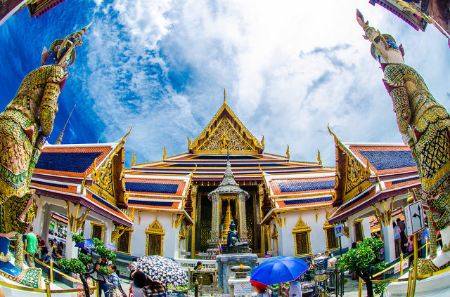 玉佛寺(Temple of the Emerald Buddha) 泰国三大国宝之一的玉佛寺也是大王宫的一部分,光是面积就占了大王宫的1/4!寺内四周还有一面长约1公里的壁画长廊,上面描绘了大量古典文学的色彩连环画,还填写了泰文诗集。至于备受尊崇的镇寺之宝——玉佛,则是放在大雄宝殿中,据说每年夏季、雨季和冬季换季时分,都会由国王亲自来替玉佛更衣,玉佛的地位就可见一斑了。